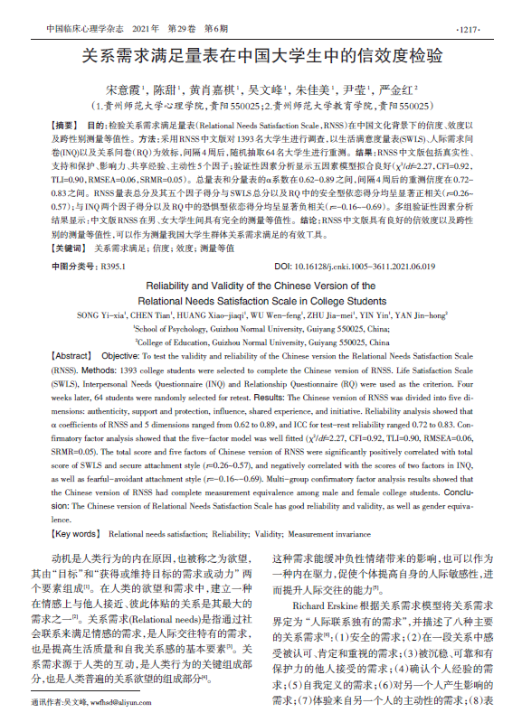 14.硕士研究生宋意霞作为第一作者,吴文峰教授作为通讯作者,2021年12月在CSSCI期刊《中国临床心理学杂志》发表了题为“关系需求满足量表在中国老员工中的信效度检验”的学术论文。