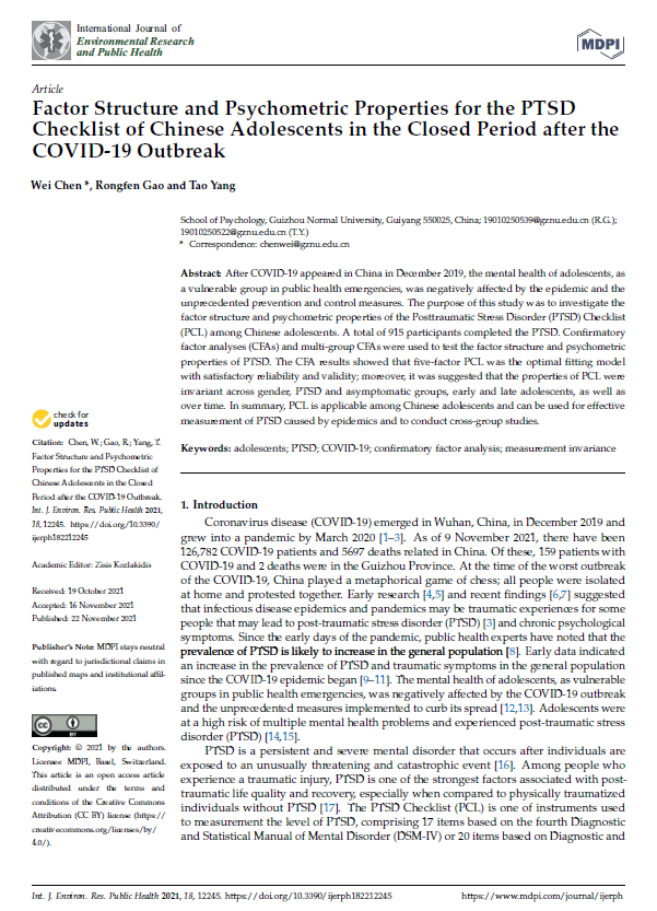 2.陈维教授作为第一作者,2021年11月在SSCIJCR一区期刊《International Journal of Environmental Research and Public Health》发表了题为“Factor Structure and Psychometric Properties for the PTSD Checklist of Chinese Adolescents in the Closed Period after the COVID-19 Outbreak”的学术论文。