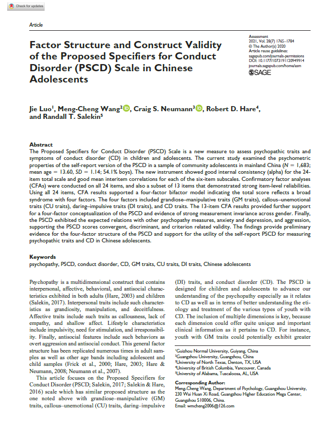 3.罗杰教授作为第一作者,2021年8月在SSCIJCR一区期刊《Assessment》发表了题为“Factor structure and construct validity of the Proposed Specifiers for Conduct Disorder (PSCD) Scale in Chinese adolescents”的学术论文。