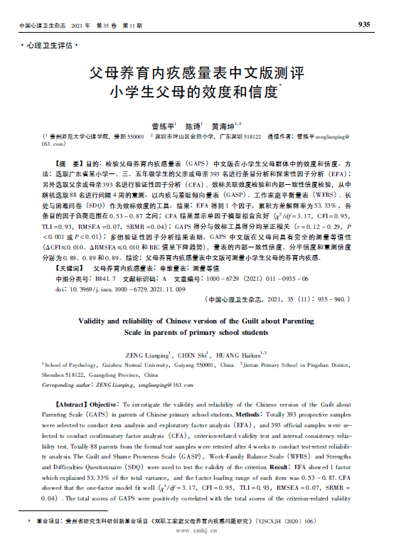 17.曾练平教授作为第一作者,2021年10月在CSCD期刊《中国心理卫生杂志》发表了题为“父母养育内疚感量表中文版测评小员工父母的效度和信度”的学术论文。