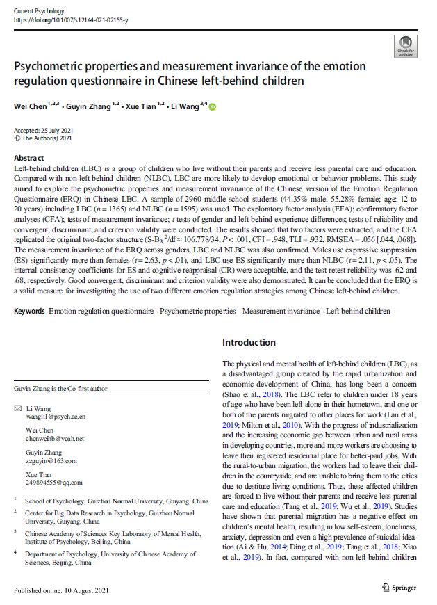1.陈维教授作为第一作者,2021年8月在SSCIJCR一区期刊《Current Psychology》发表了题为“Psychometric properties and measurement invariance of the emotion regulation questionnaire inChinese left-behind children”的学术论文。