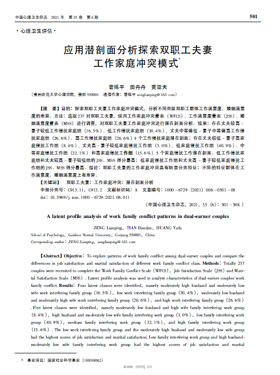 5.曾练平教授作为第一作者,2021年5月在CSCD期刊《中国心理卫生杂志》发表了题为“应用潜剖面分析探索双职工夫妻工作家庭冲突模式”的学术论文。