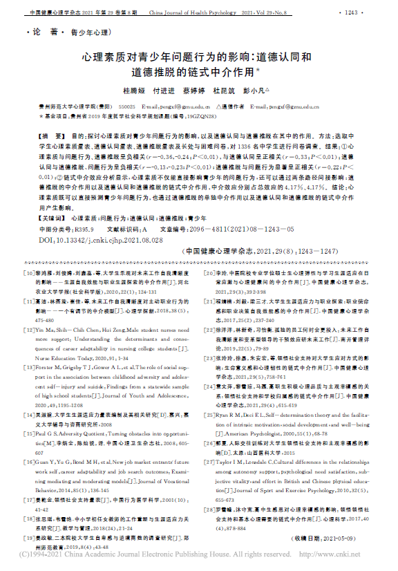 6.硕士研究生桂腾娅作为第一作者,彭小凡副教授作为通讯作者,2021年6月在中文核心期刊《中国健康心理学杂志》发表了题为“心理素质对青少年问题行为的影响:道德认同和道德推脱的链式中介作用”的学术论文。