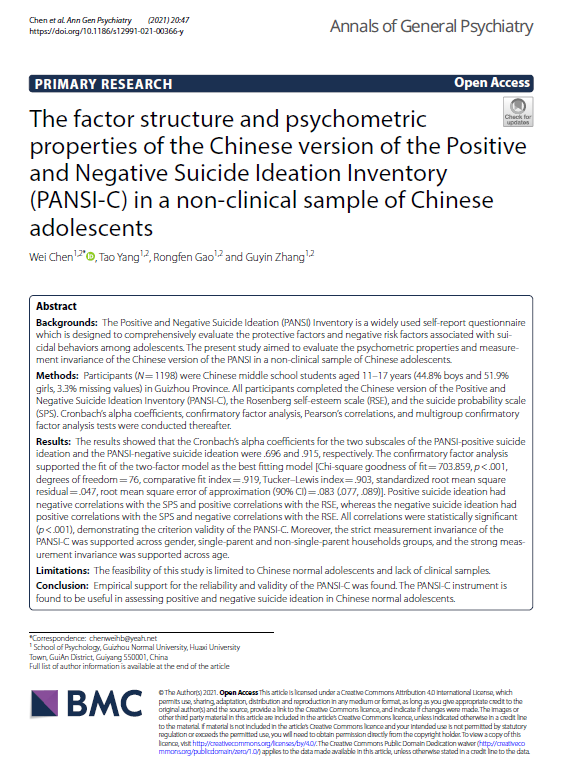 6.陈维教授作为第一作者,2021年9月在SSCIJCR二区期刊《Annals of General Psychiatry》发表了题为“The factor structure and psychometric properties of the Chinese version of the Positive and Negative Suicide Ideation Inventory (PANSI‑C) in a non‑clinical sample of Chinese adolescents”的学术论文。