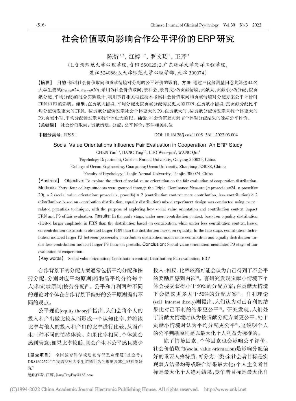 4.陈衍副教授作为第一作者,2022年6月在CSSCI期刊《中国临床心理学杂志》发表了题为“价值取向影响公平评价的ERP研究”的学术论文。研究选取老员工群体,采用ERP技术进行混合实验设计,探讨社会价值取向和贡献情境对分配的公平评价的影响。