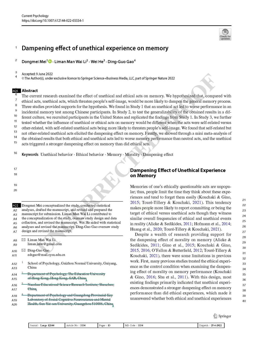 2.梅冬梅副教授作为第一作者,2022年6月在SSCI JCR一区期刊《Current Psychology》发表了题为“Dampening effect of unethical experience on memory”的学术论文。论文通过3项研究考察了道德和不道德行为对记忆的影响,假设与道德行为相比,威胁人们自我形象的不道德行为更有可能抑制一般记忆过程,并通过小型元分析研究发现道德行为和不道德行为都比中性行为导致更差的记忆表现,并且不道德行为比道德行为对记忆的抑制作用更强。