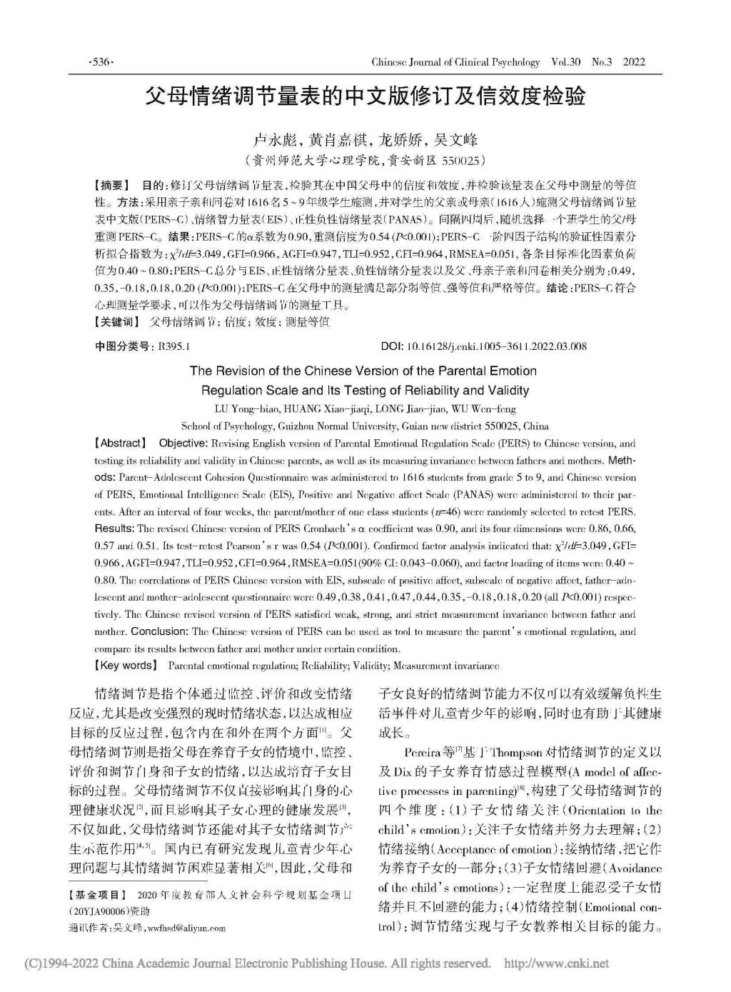 3.卢永彪副教授作为第一作者,吴文峰教授作为通讯作者,2022年6月在CSSCI期刊《中国临床心理学杂志》发表了题为“父母情绪调节量表的中文版修订及信效度检验”的学术论文。论文修订了父母情绪调节量表,检验其在中国父母中的信度和效度,并检验该量表在父母中的测量等价性。