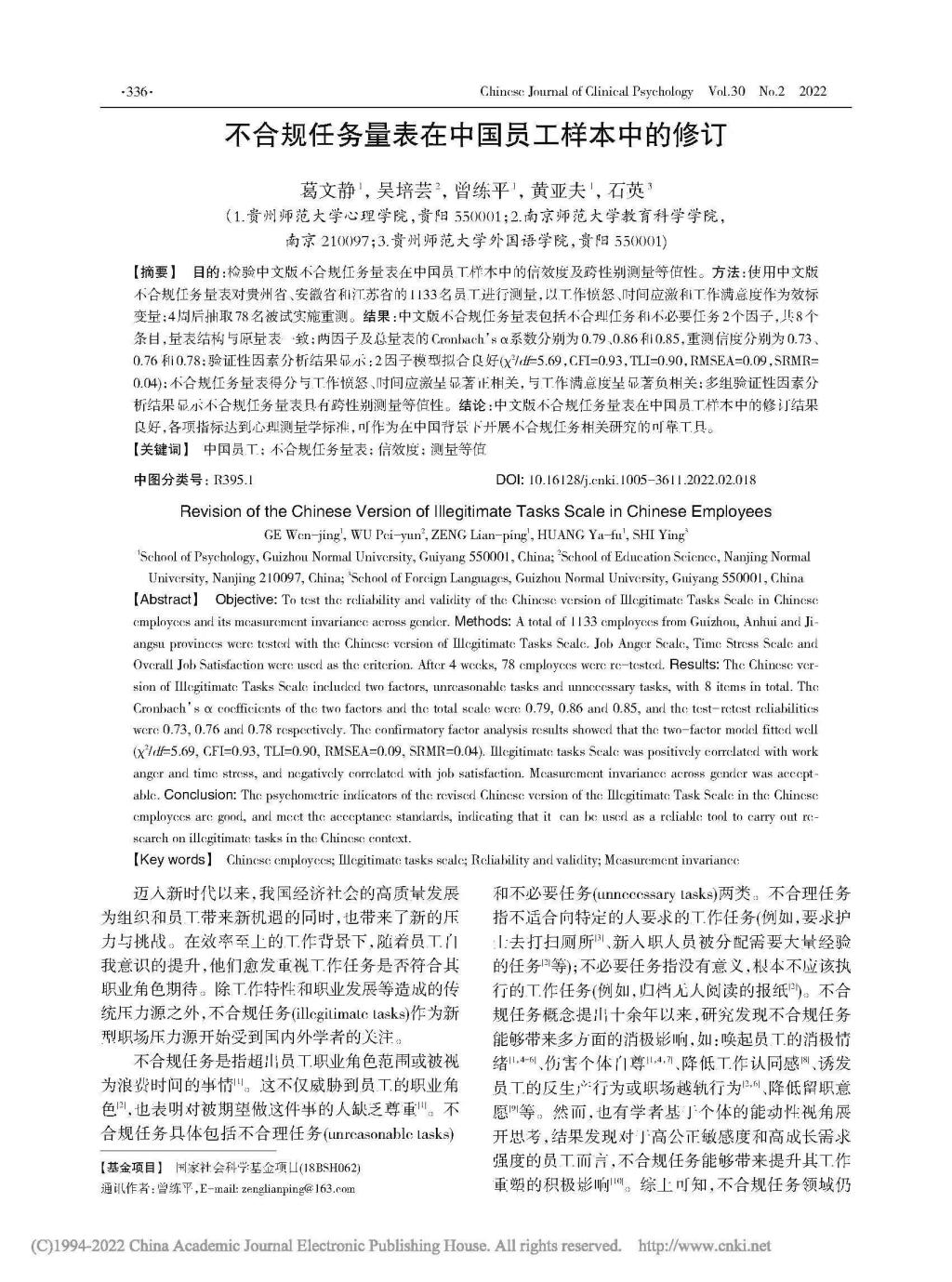 5.硕士研究生葛文静作为第一作者,曾练平教授作为通讯作者,2022年6月在CSSCI期刊《中国临床心理学杂志》发表了题为“不合规任务量表在中国员工样本中的修订”的学术论文。论文检验中文版不合规任务量表在中国员工样本中的信效度及跨性别测量等值性。