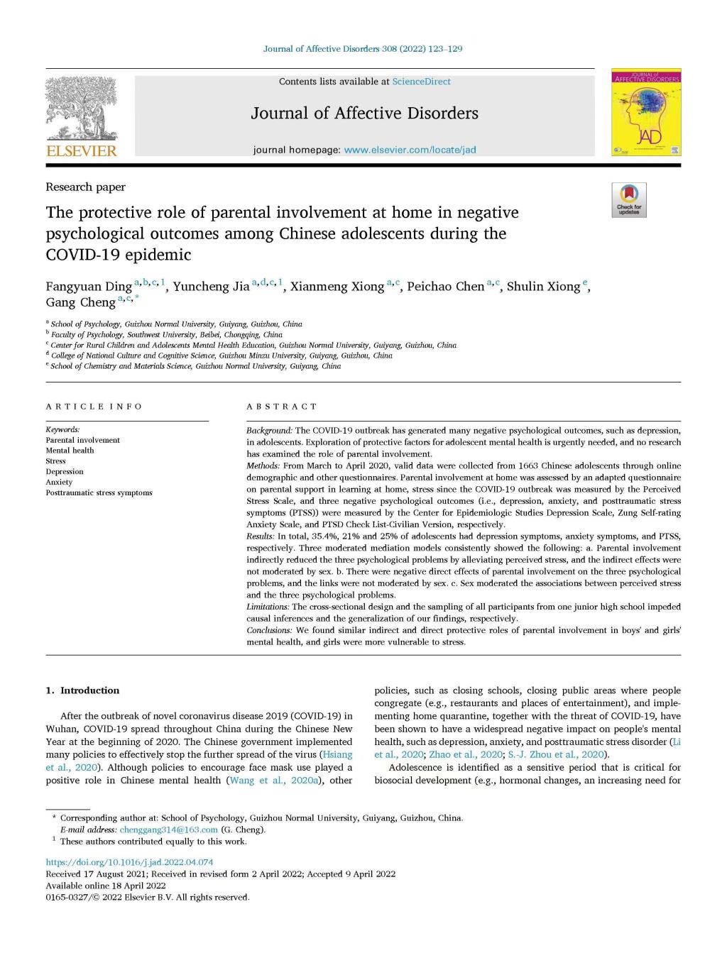 1.程刚教授作为通讯作者,2022年7月在SCI JCR一区期刊《Journal of Affective Disorders》发表了题为“The protective role of parental involvement at home in negative psychological outcomes among Chinese adolescents during the COVID-19 epidemic”的学术论文。COVID-19的爆发给青少年带来了众多负面的心理影响,如抑郁等消极情绪明显增多;因此,在这一背景下迫切需要找出对青少年心理健康有保护性的因素,其中父母教育送往在疫情居家隔离期间的保护作用,值得展开深入的研究。本研究在2020年3月至4月期间,对1663名中国青少年进行了在线调查,研究结果最终发现,在疫性隔离期间,父母教育卷入对于青少年的心理健康具有重要的保护作用;提升父母教育卷入,有助于减少疫情给青少年带来的危机反应。