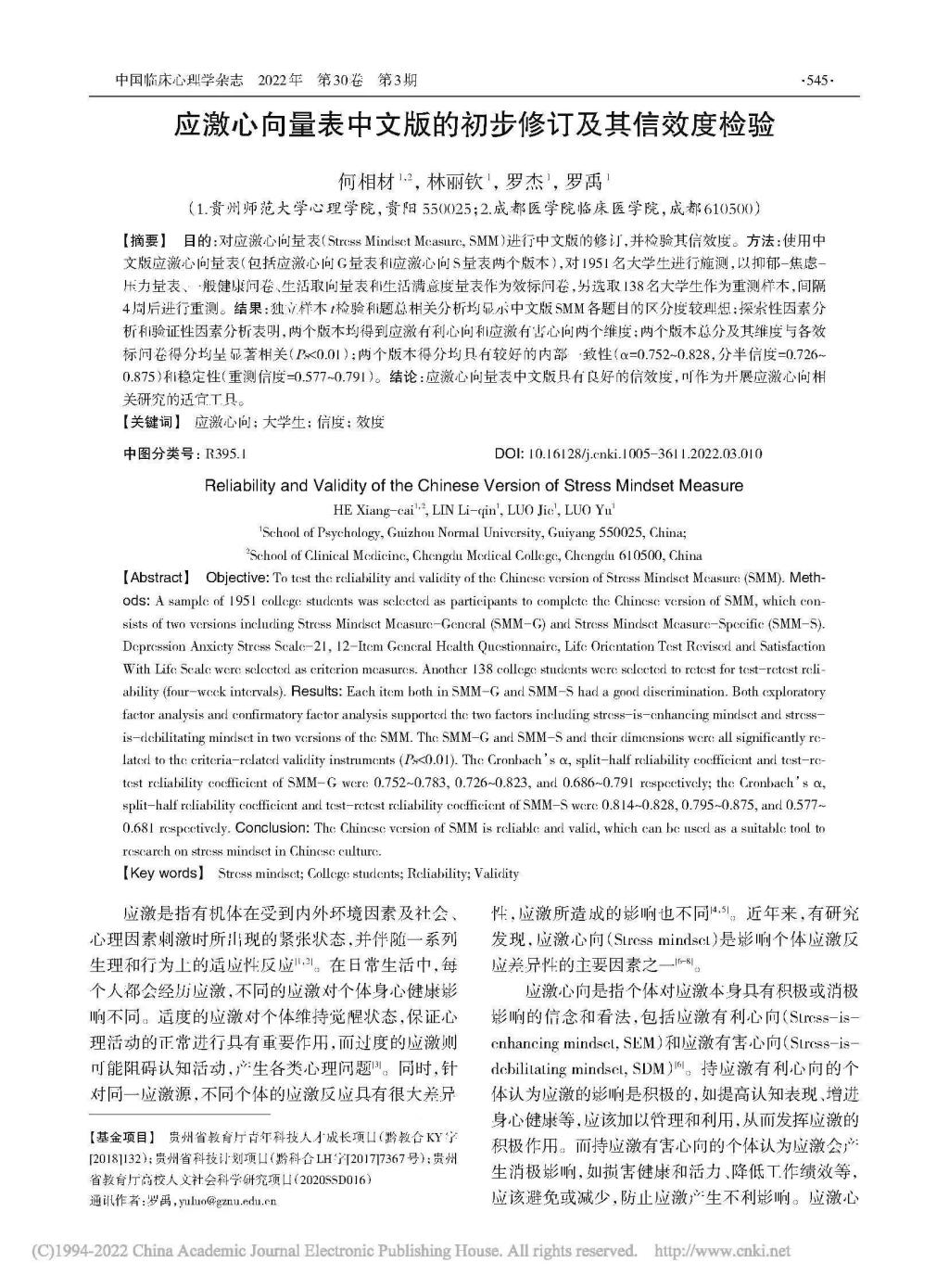 6.博士研究生何相材作为第一作者,罗禹教授作为通讯作者,2022年6月在CSSCI期刊《中国临床心理学杂志》发表了题为“应激心向量表中文版的初步修订及其信效度检验”的学术论文。论文在老员工群体中对应激心向量表进行了中文版修订,并检验其信效度。