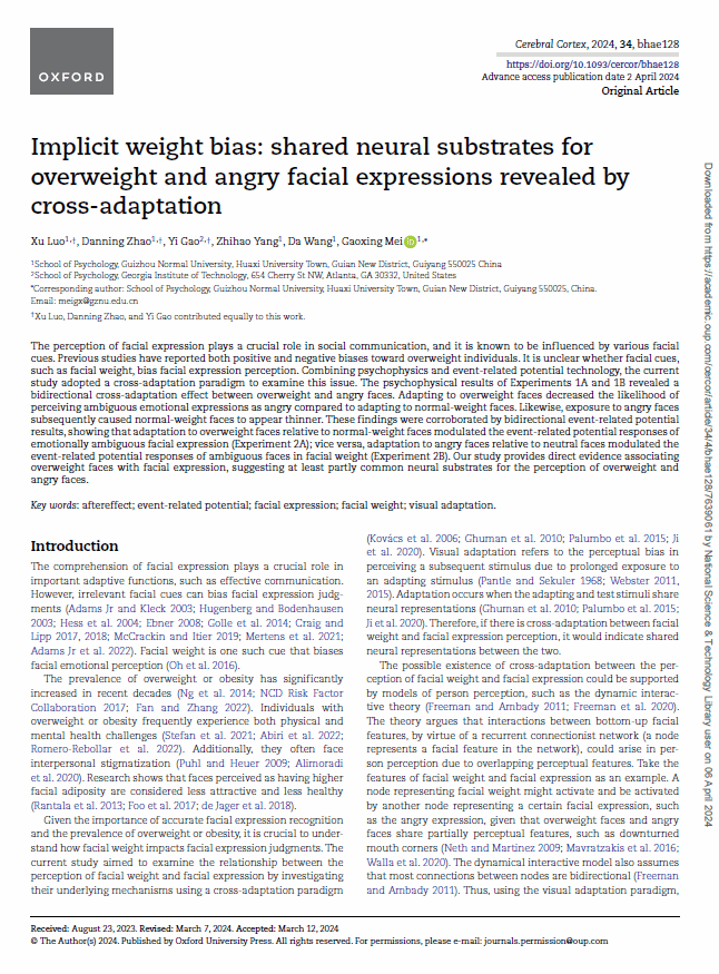 8. 研究生罗旭作为第一作者,梅高兴教授作为通讯作者,2024年4月在中科院SCI二区期刊《Cerebral Cortex》上发表了题为“Implicit weight bias: shared neural substrates for overweight and angry facial expressions revealed by cross-adaptation”的研究论文。