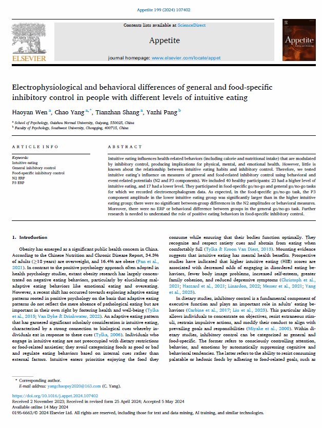 5. 研究生闻浩言作为第一作者,杨超副教授作为通讯作者,2024年5月在中科院SCI二区Top期刊《Appetite》上发表了题为“Electrophysiological and behavioral differences of general and food-specific inhibitory control in people with different levels of intuitive eating”的研究论文。
