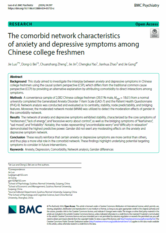 7. 罗杰教授作为第一作者,2024年4月在中科院SCI二区Top期刊《BMC Psychiatry》上发表了题为“The comorbid network characteristics of anxiety and depressive symptoms among Chinese college freshmen”的研究论文。