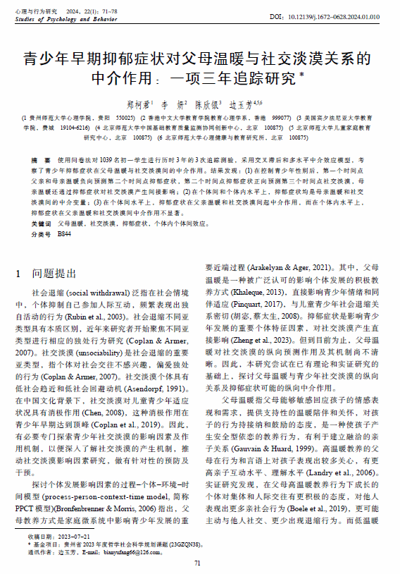 15. 郑柯君老师作为第一作者,2024年1月在CSSCI期刊《心理与行为研究》上发表了题为“青少年早期抑郁症状对父母温暖与社交淡漠关系的中介作用:一项三年追踪研究”的研究论文。