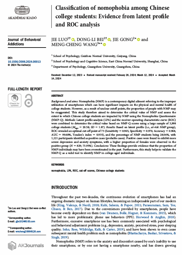3. 罗杰教授作为第一作者,2024年4月在中科院SCI一区期刊《Journal of Behavioral Addictions》上发表了题为“Classification of nomophobia among Chinese college students: Evidence from latent profile and ROC analysis”的研究论文。