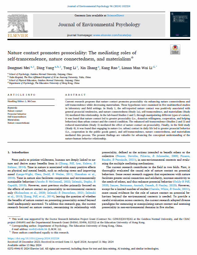 梅冬梅副教授作为第一作者,2024年5月在中科院SSCI一区Top期刊《Journal of Environmental Psychology》上发表了题为“Nature contact promotes prosociality: The mediating roles of self-transcendence, nature connectedness, and materialism”的研究论文。