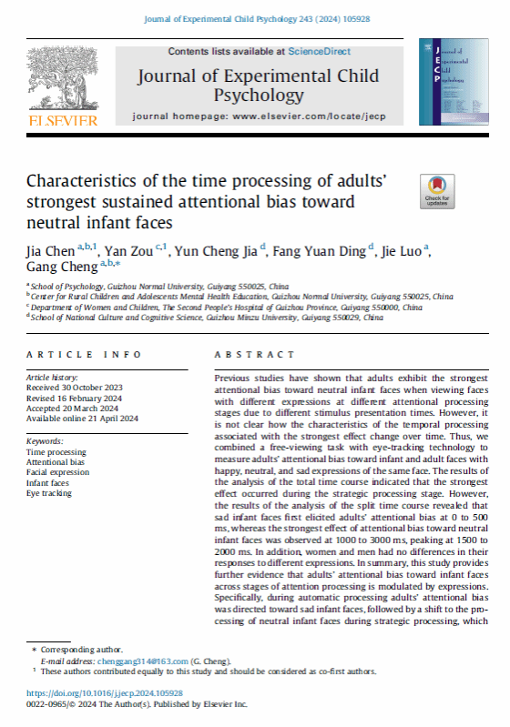9. 陈加老师作为第一作者,程刚教授作为通讯作者,2024年4月在中科院SSCI二区期刊《Journal of Experimental Child Psychology》上发表了题为“Characteristics of the time processing of adults’ strongest sustained attentional bias toward neutral infant faces”的研究论文。