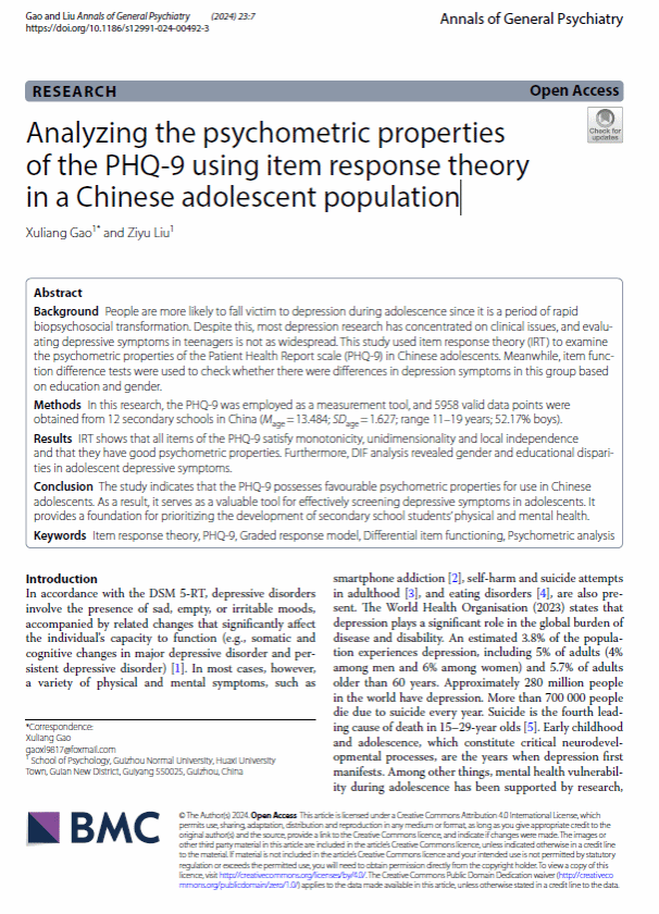 12. 高旭亮副教授作为第一作者,2024年1月在中科院SSCI三区期刊《Annals of General Psychiatry》上发表了题为“Analyzing the psychometric properties of the PHQ-9 using item response theory in a Chinese adolescent population”的研究论文。