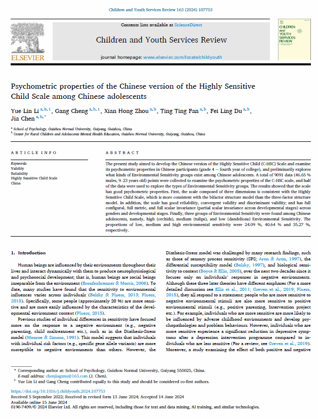 4. 研究生李岳麟和程刚教授作为共同第一作者,陈加老师作为通讯作者,2024年6月在中科院SSCI二区Top期刊《Children and Youth Services Review》上发表了题为“Psychometric properties of the Chinese version of the Highly Sensitive Child Scale among Chinese adolescents”的研究论文。