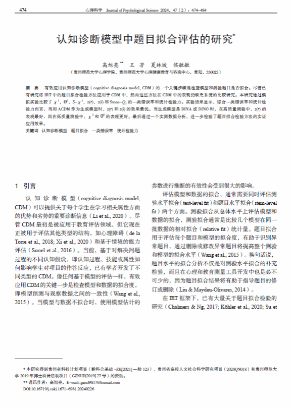 14. 高旭亮副教授作为第一作者,2024年3月在CSSCI期刊《心理科学》上发表了题为“认知诊断模型中题目拟合评估的研究”的研究论文。