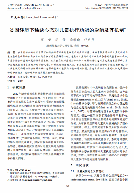 13. 蒋莹副教授作为第一作者,2024年3月在CSSCI期刊《心理科学进展》上发表了题为“贫困经历下稀缺心态对儿童执行功能的影响及其机制”的研究论文。