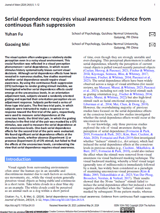 10. 研究生付昱涵作为第一作者,梅高兴教授作为通讯作者,2024年5月在中科院SCI四区期刊《Journal of Vision》上发表了题为“Serial dependence requires visual awareness: Evidence from continuous flash suppression”的研究论文。