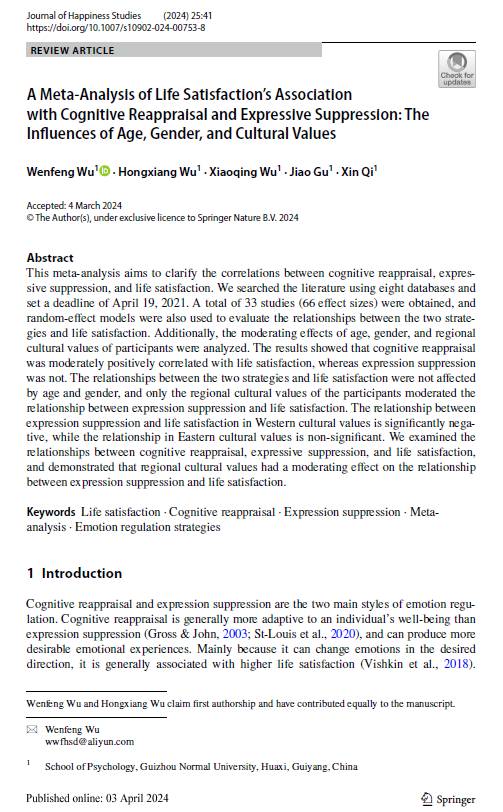 6. 吴文峰教授作为第一作者,2024年4月在中科院SSCI二区Top期刊《Journal of Happiness Studies》上发表了题为“A Meta-Analysis of Life Satisfaction’s Association with Cognitive Reappraisal and Expressive Suppression: The Influences of Age, Gender, and Cultural Values”的研究论文。