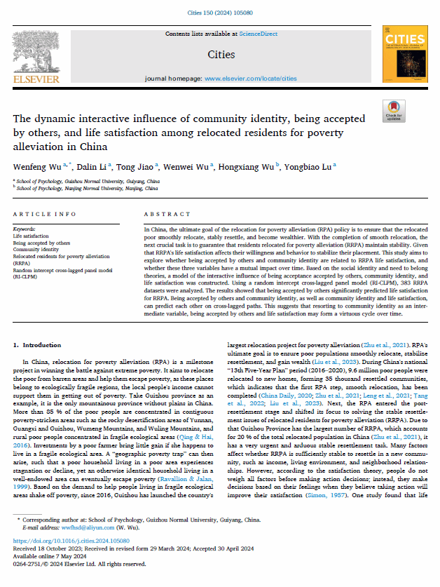 2. 吴文峰教授作为第一作者,2024年5月在中科院SSCI一区Top期刊《Cities》上发表了题为“The dynamic interactive influence of community identity, being accepted by others, and life satisfaction among relocated residents for poverty alleviation in China”的研究论文。