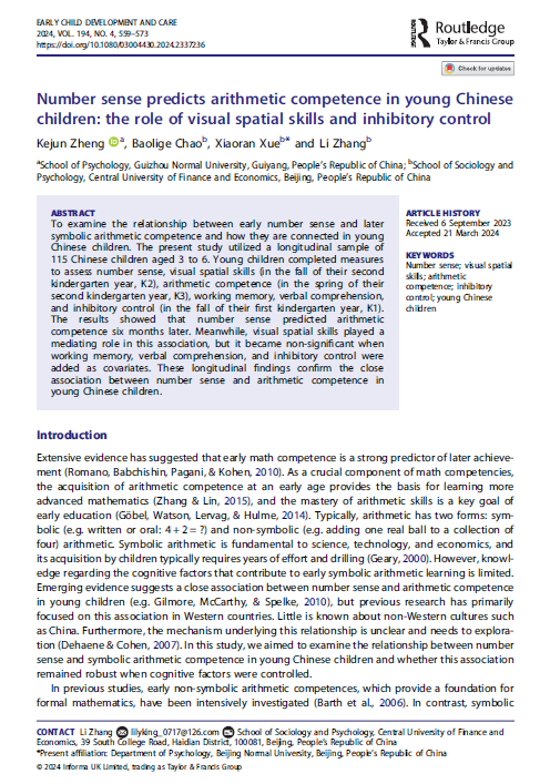 11. 郑柯君老师作为第一作者,2024年4月在中科院SSCI四区期刊《Early Child Development and Care》上发表了题为“Number sense predicts arithmetic competence in young Chinese children: the role of visual spatial skills and inhibitory control”的研究论文。