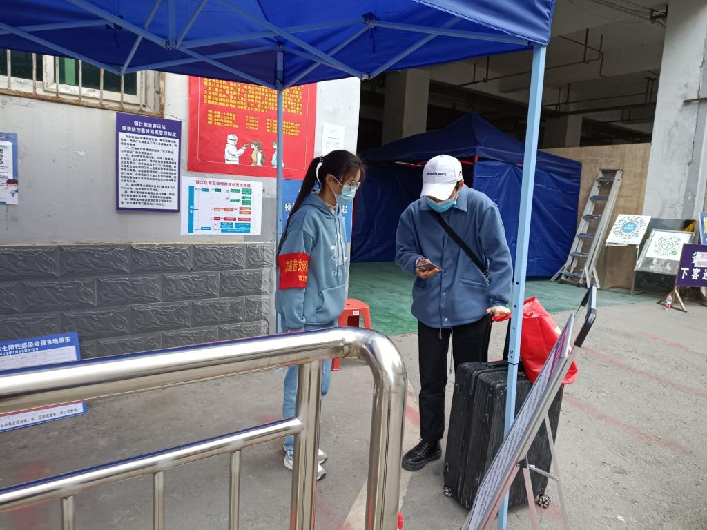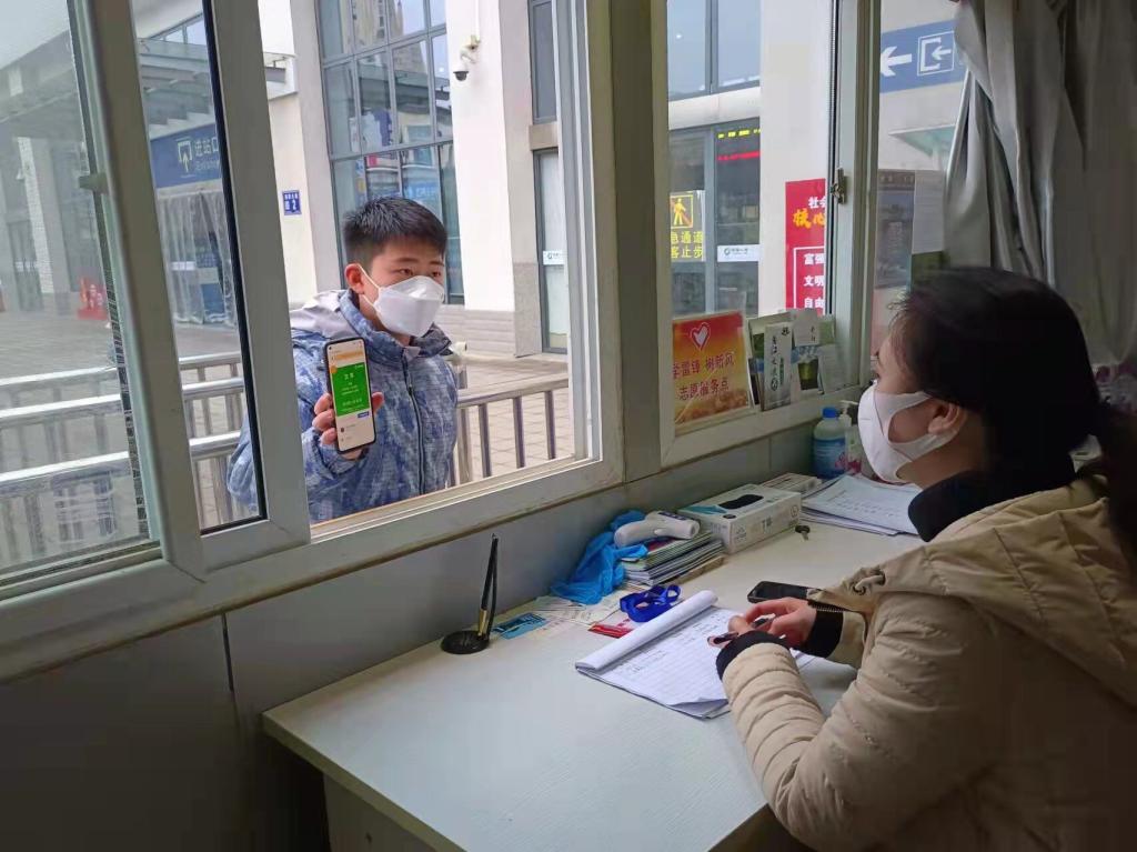 2021级应用心理学班王凤,在家乡——贵州省铜仁市松桃县寨英镇半沟村,参与到铜仁汽车旅游客运站的疫情防控工作,为返乡的乘客检测体温登记,提醒乘客佩戴口罩等。