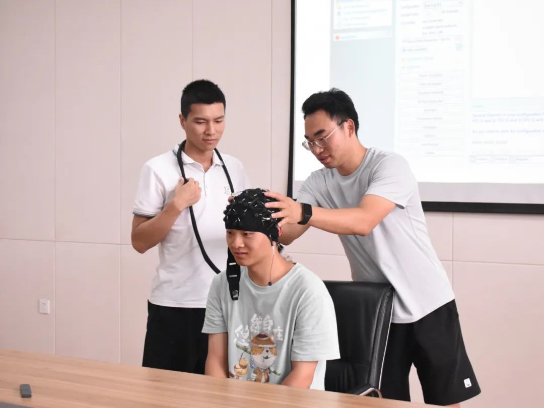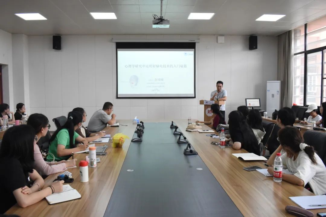 上午,念靖晴对脑电技术在心理学研究中的应用进行了深入介绍,分别从脑电技术的发展、研究选题的确定、实验程序的编写、数据采集和分析,以及数据结果的呈现和报告等方面分享了宝贵经验,并对实验室的预约使用流程、核心设备的功能和使用方法进行了讲解。下午,念靖晴详细讲解了ERP实验流程和注意事项,并对所需材料和用具进行详细介绍,他一一演示并指导同学们如何操作ERP实验设备。