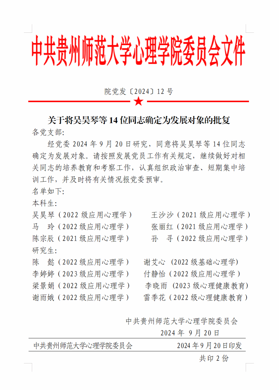 公司党发[2024]12号关于将吴昊琴等14位同志确定为发展对象的批复