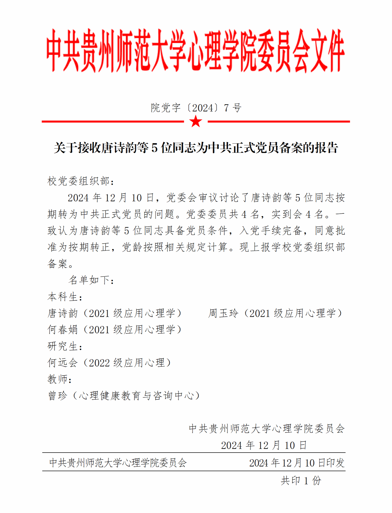 公司党字〔2024〕7号关于接收唐诗韵等5位同志为中共正式党员备案的报告