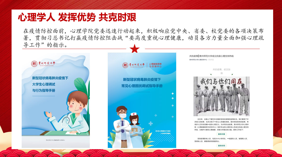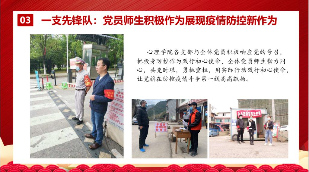 通过回顾疫情以来,mk体育官方网站入口党委为了筑牢防疫第一线主动作为,发布了《给心灵戴上防护的“口罩” ——致广大师生的一封公开信》,开设心理支持热线、组建“疫情心理健康助力推文工作小组”、开展疫情普查及调研、实施返校员工心理筛查、党员师生主动投身抗疫志愿服务等方面内容,向公司师生全面呈现了心理学人在面对疫情时敢作为、能作为的决心和信心。