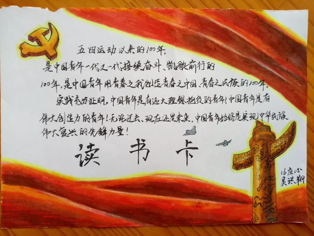 支部成员在自主学习习总书记在纪念五四运动100周年大会上的讲话后,根据个人学习情况,摘抄使自己深受启发的语段,并结合师范生专业技能,将其呈现在自己精心设计的读书卡上,并在支部内进行传阅,同时分享学习心得。
