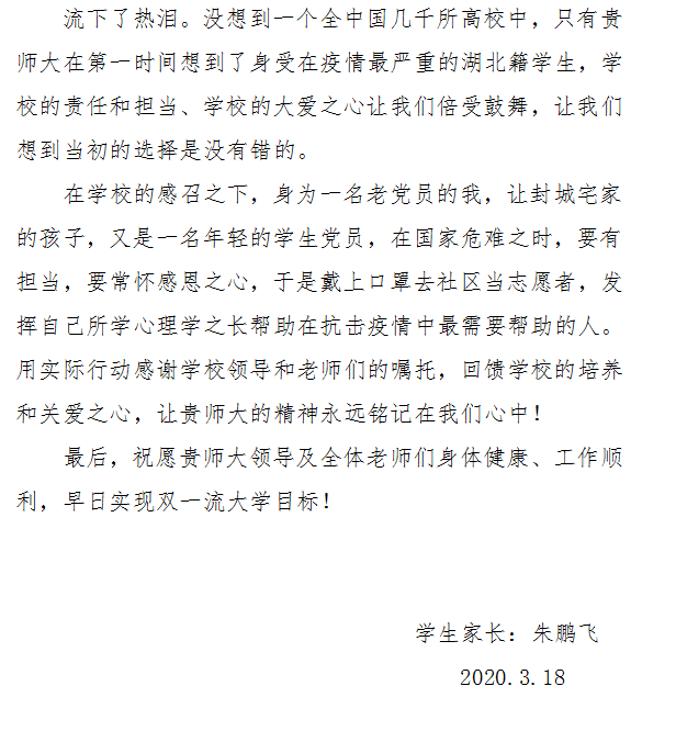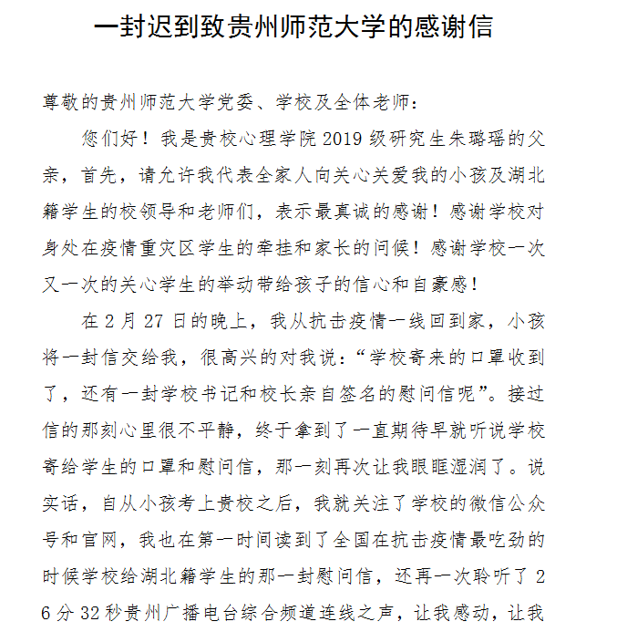 2月19日,mk体育官方平台给146位在鄂员工寄去了慰问信和口罩,这一善举感动着每位师生家长。同时公司家住湖北利川的19级研究生党员朱璐瑶随后收到了这暖心的问候,展信读信之时,全家人为此深深打动,其父亲给公司写来了一封感谢信!