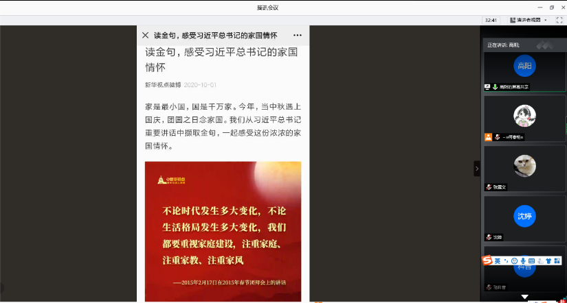 会议首先分享了支部成员于10月1日早上,线上观看天安门升旗仪式的图片;接下来,在支部书记的带领下,全体成员认真学习了习近平总书记重要讲话中撷取的金句,从中感受习总书记的家国情怀;最后支部成员们分享了作为一名新时代老员工,自己心目中的家国情怀。