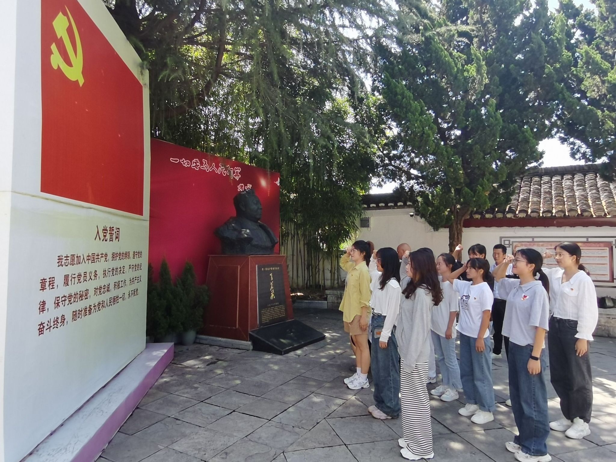 在王若飞故居广场内,党支部书记高阳带领全体党员面对党旗,重温入党誓词。