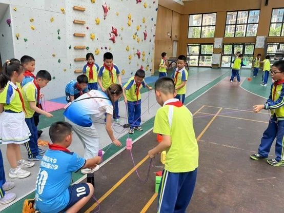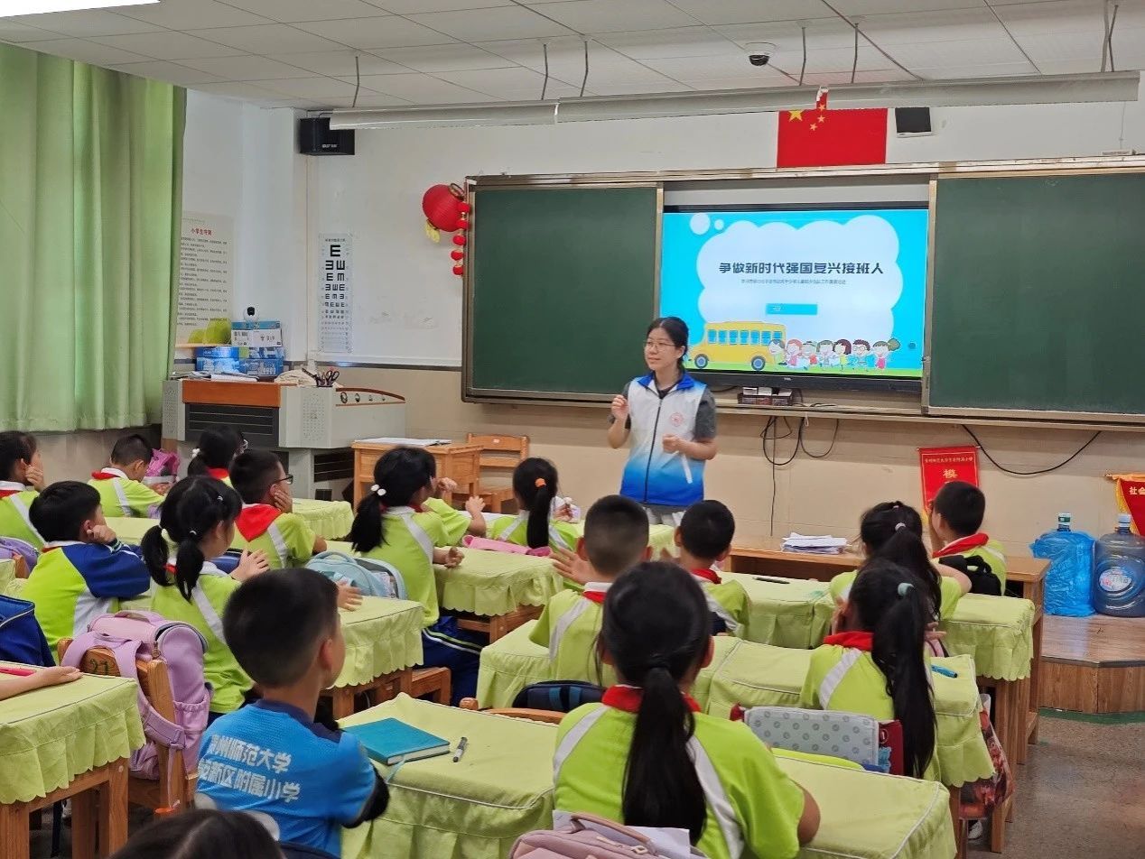 活动伊始,mk体育2023级应用心理学团支部副书记张乐源,为少先队员们讲授《争做新时代强国复兴接班人》为主题的队课。以团员身份带领少先队员们深入学习了“习近平致中国少年先锋队第九次全国代表大会的贺信”精神,深刻阐释新时代青少年肩负的历史使命,并系统介绍了“五育并举”的育人理念。课堂着重强调团结协作对少先队集体的重要性,为后续素质拓展活动埋下思想根基。