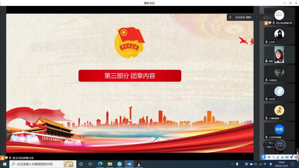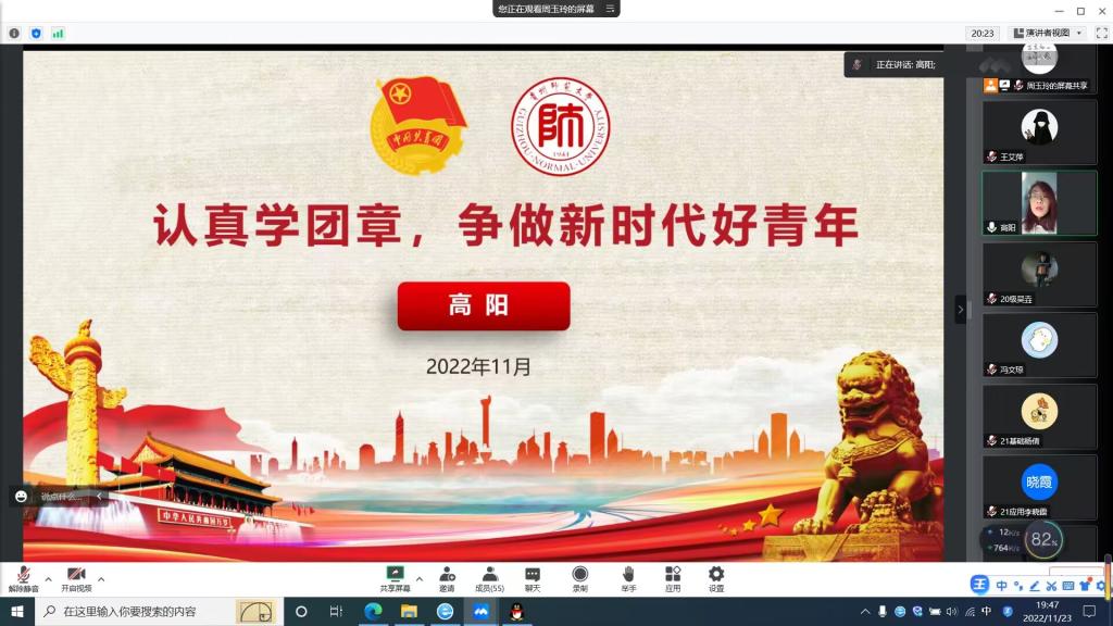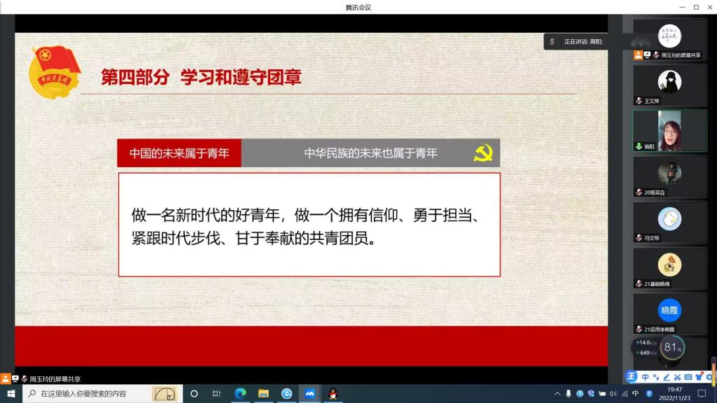 为深入学习贯彻团章,掌握团章的精神实质,夯实团员青年思想政治教育,2022年11月23日,mk体育2022-2023学年团校培训班开展了题为《认真学团章,争做新时代好青年》的线上专题团课,院团委书记高阳担任主讲,团校培训班全体成员参与。