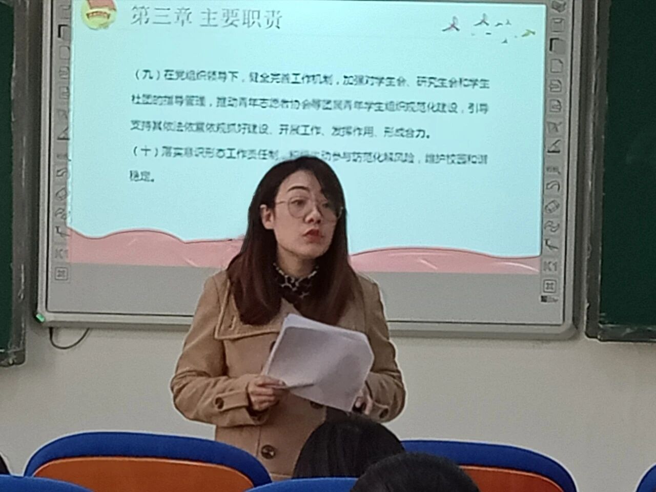 团课伊始,高老师领学习《中国共产主义青年团普通高等公司基层组织工作条例》全文。接着,从总则,高校团委、院级团组织的主要职责,高校员工团支部的主要职责等三个方面进行了深入讲解。高老师强调,公司全体团学骨干必须认真学习《工作条例》,高举中国特色社会主义伟大旗帜,全面贯彻习近平新时代中国特色社会主义思想,增强“四个意识”、坚定“四个自信”、做到“两个维护”。她提到,公司两级团组织要明确自身工作职责,加强理论修养、政治修养、道德修养、纪律修养和作风修养,切实履行引领凝聚青年、组织动员青年、联系服务青年的职责,引领广大团员青年成长为有理想、敢担当、能吃苦、肯奋斗的新时代好青年。